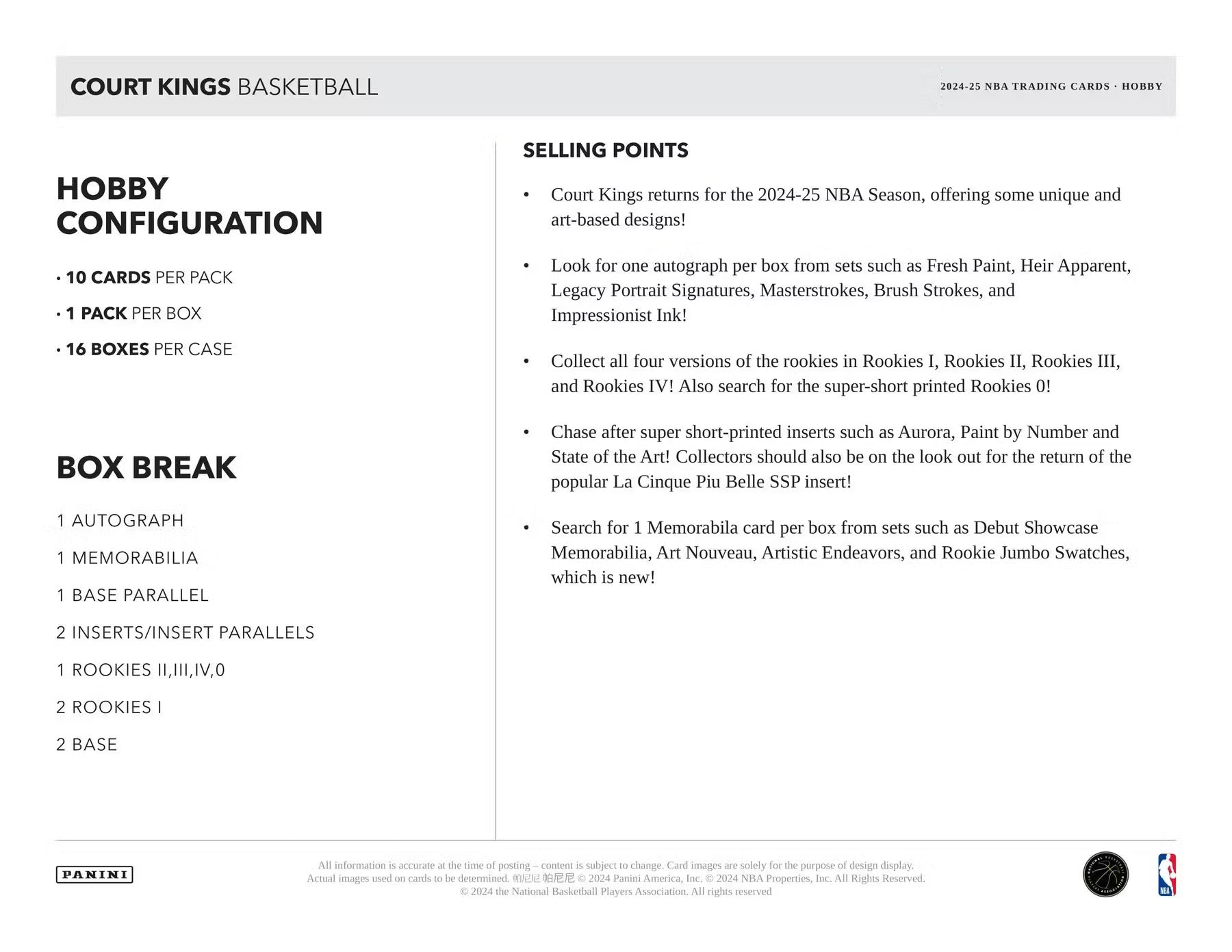 La boîte Hobby 2024/25 Panini Court Kings Basketball contient 1 paquet de 10 cartes.